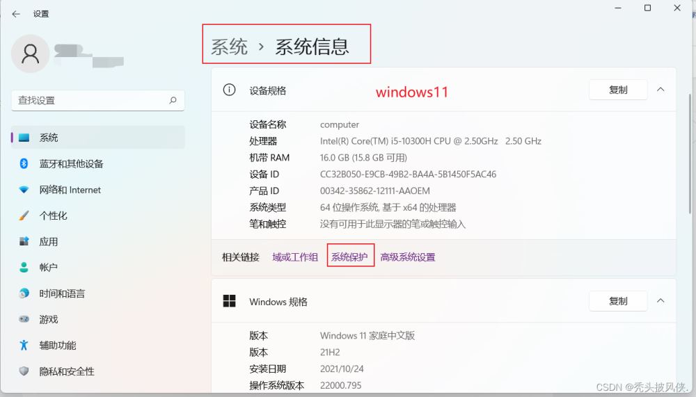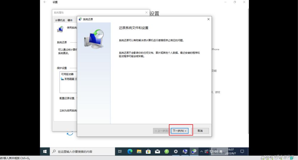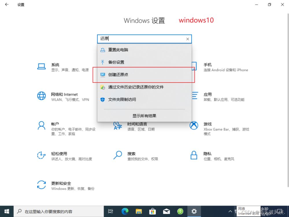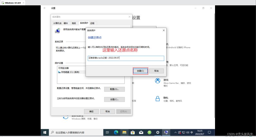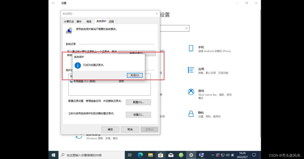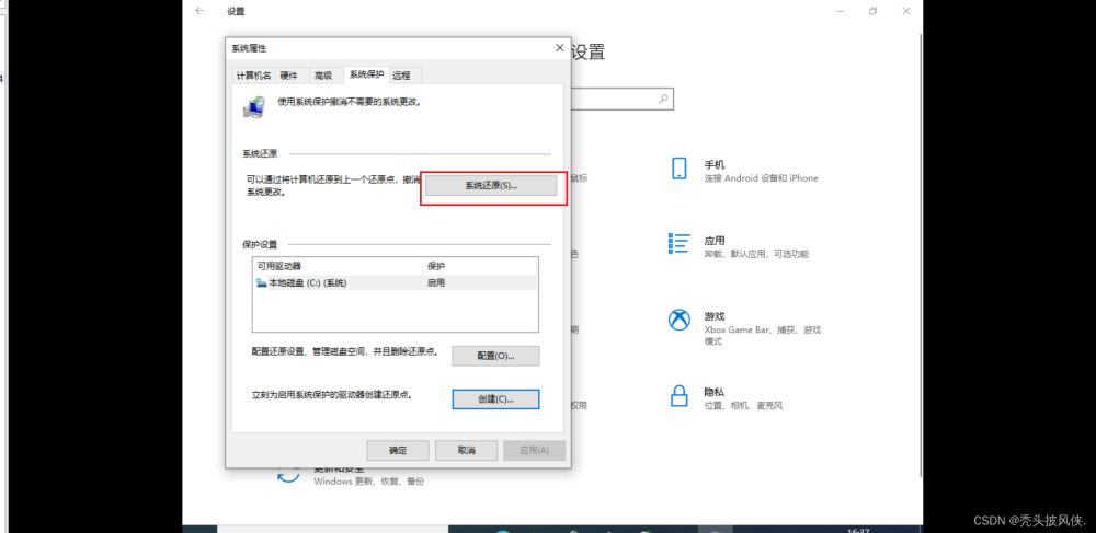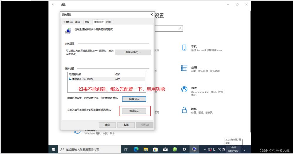 在設(shè)置中進(jìn)入創(chuàng)建還原點(diǎn)的界面