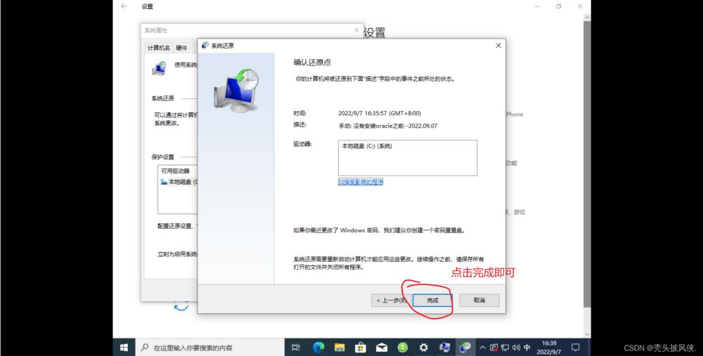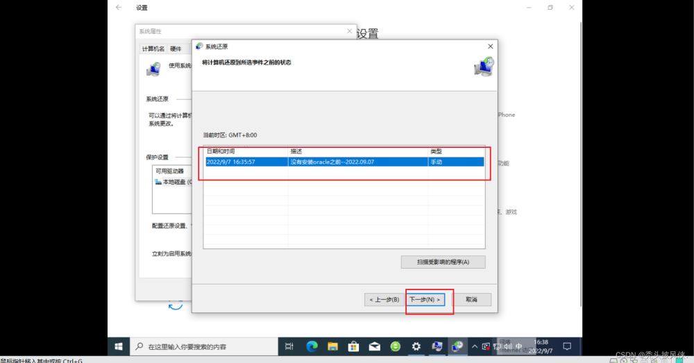 上面已經(jīng)成功創(chuàng)建了還原點(diǎn),如果安裝oracle時(shí)出現(xiàn)問(wèn)題,自己也無(wú)法解決,恢復(fù)到安裝之前即可,恢復(fù)步驟如下