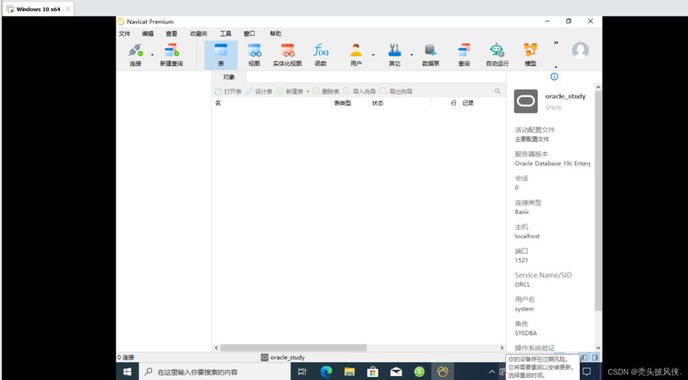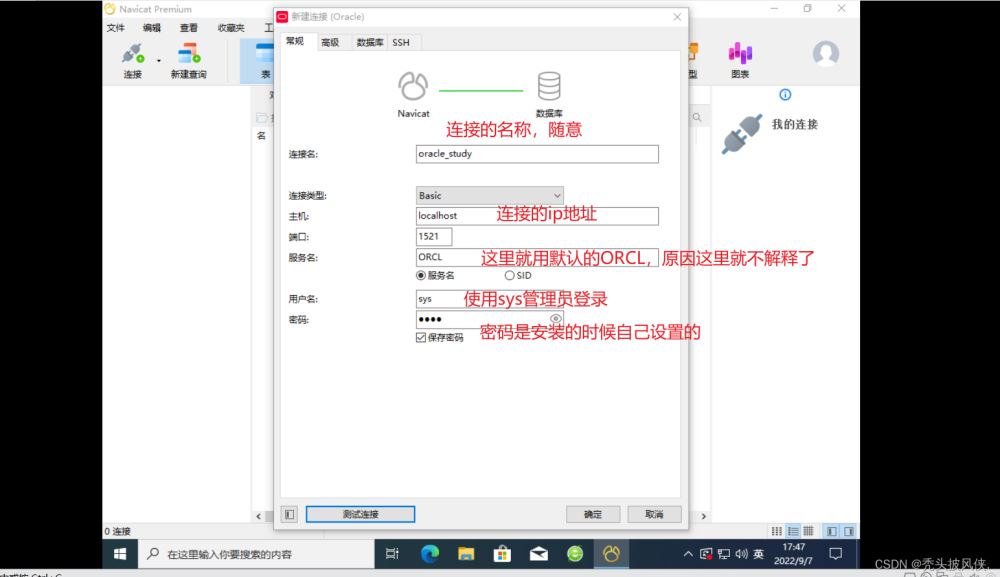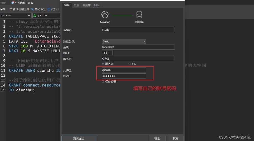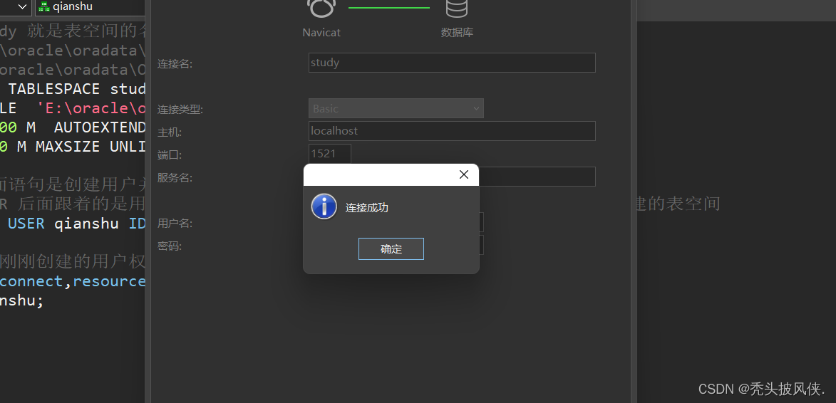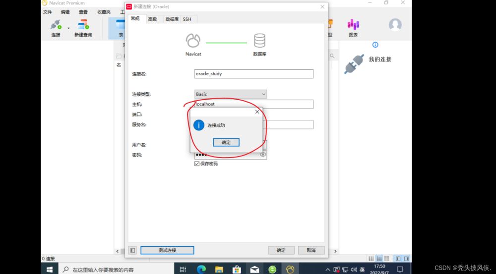 完成上面步驟之后打開navicat,進(jìn)行oracle連接,賬號(hào)密碼就是剛剛創(chuàng)建用戶的賬號(hào)密碼、