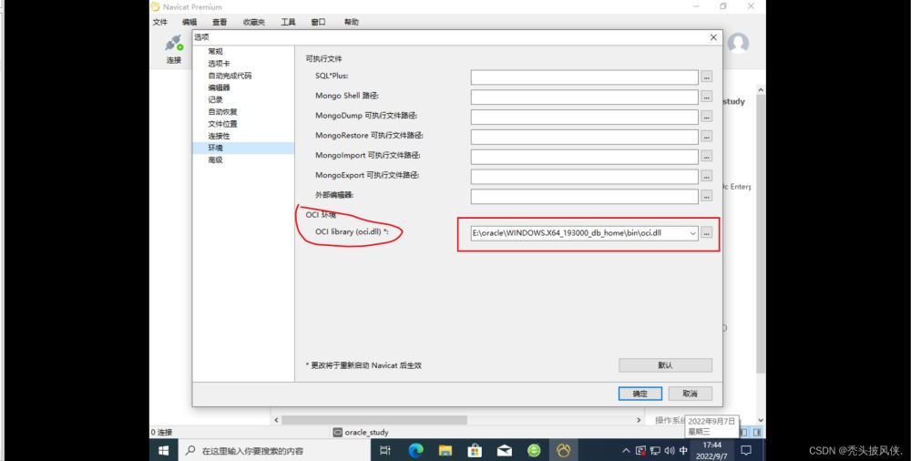 這里將oci環(huán)境設(shè)置為oracle的解壓目錄下的bin\oci.dll,然后點(diǎn)擊確定,重啟navicat