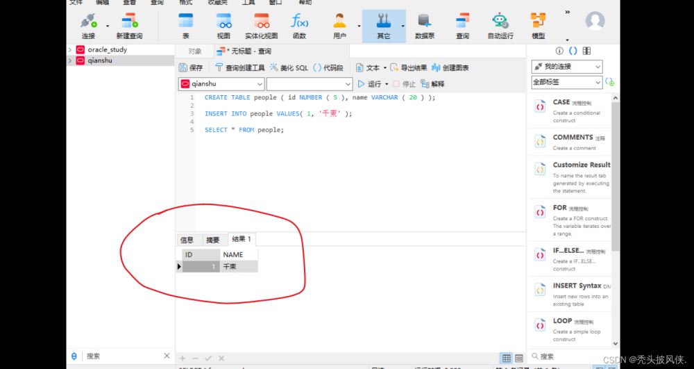 CREATE TABLE people ( id NUMBER ( 5 ), name VARCHAR ( 20 ) );INSERT INTO people VALUES( 1, "千束" );SELECT * FROM people;