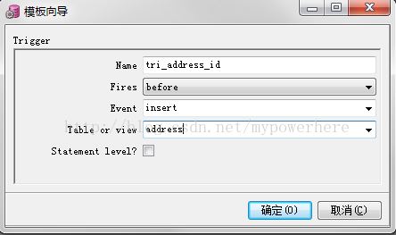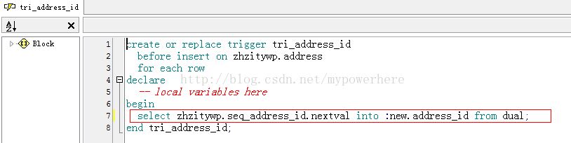該觸發(fā)器在數(shù)據(jù)庫注冊了表的偵聽,即當指定表address插入記錄之前,我們調(diào)用序列的nextval獲得新值,插入需要自增的字段。