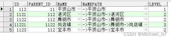 select id, parent_id, name, sys_connect_by_path(name, "->") namepath, levelfrom area_teststart with name = "平頂山市"connect by prior id = parent_id