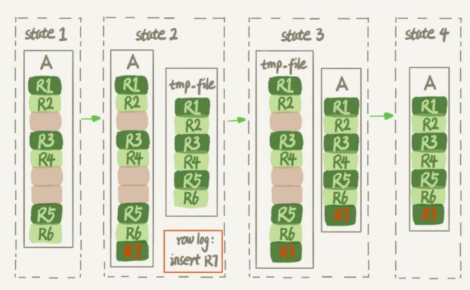 - 生成臨時文件的過程中,將所有對A的操作記錄在一個日志文件rowlog中,對應(yīng)的是圖中state2的狀態(tài);