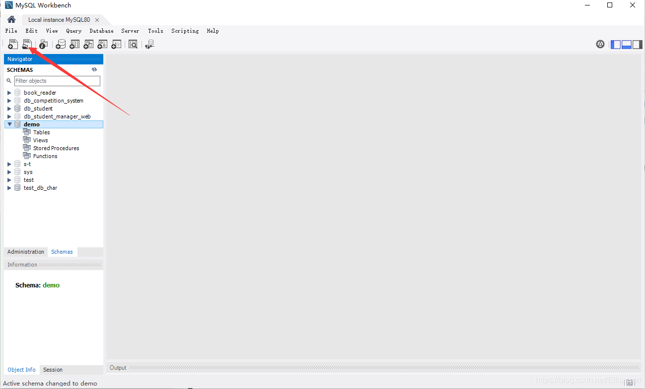 ①.新建一個數(shù)據(jù)庫demo(名字任取),點擊指示圖標(或者File欄里面的Open SQL Script…)