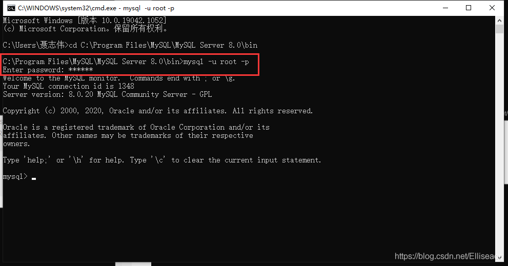 3.輸入“mysql -u root -p”,再輸入數(shù)據(jù)庫密碼;