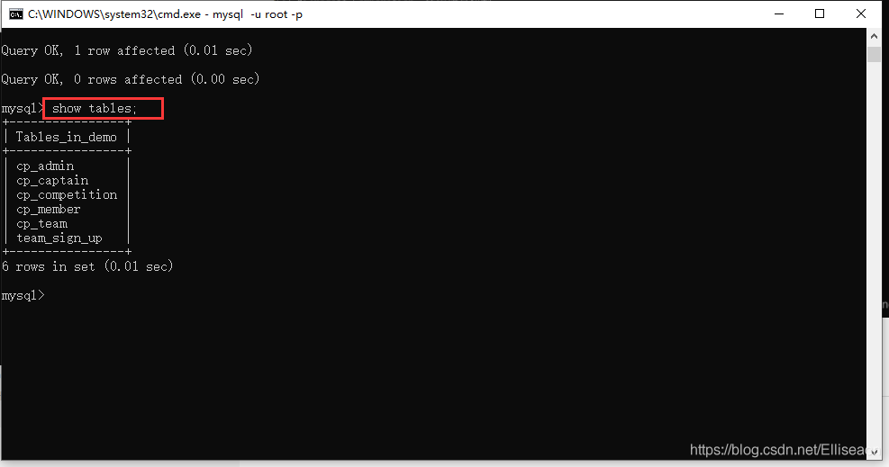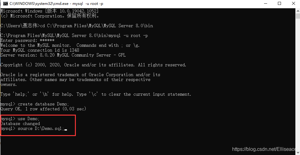 5.選中數(shù)據(jù)庫use Demo;選中導入路徑source D:/Demo.sql;