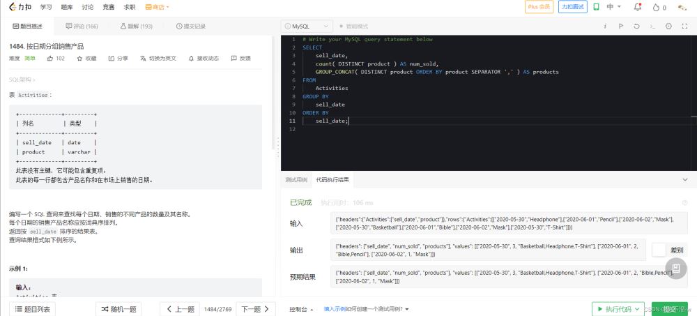 -- GROUP_CONCAT(DISTINCT 要拼接的字段 ORDER BY 排序字段 ASC/DESC SEPARATOR "分隔符")-- 不好寫例子,直接借用的leetCode上的題SELECT sell_date, count( DISTINCT product ) AS num_sold, GROUP_CONCAT( DISTINCT product ORDER BY product SEPARATOR "," ) AS products FROM Activities GROUP BY sell_date;
