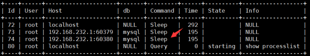 連接完成后,如果你沒有后續的動作,這個連接就處于空閑狀態,你可以在 show processlist 命令中看到它。文本中這個圖是 show processlist 的結果,其中的 Command 列顯示為“Sleep”的這一行,就表示現在系統里面有一個空閑連接,關閉連接 kill 。