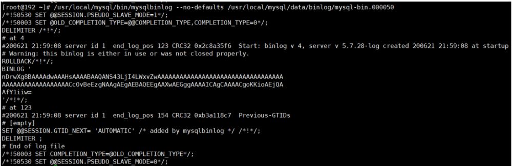 mysql> /usr/local/mysql/bin/mysqlbinlog --no-defaults /usr/local/mysql/data/binlog/mysql-bin.000001 查看binlog內容