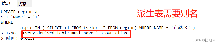 解決MySQL報(bào)錯(cuò):You can‘t specify target table ‘region‘ for update in FROM clause