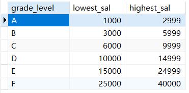 這里涉及 job_grades 表,通過查詢可知,每個薪水都有其相應的等級區間。