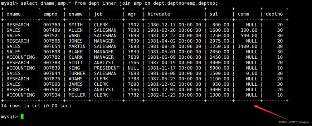 - 在on子句后指明內連接的條件為員工的部門號等于部門的部門號,保證篩選出來的數據是有意義的。