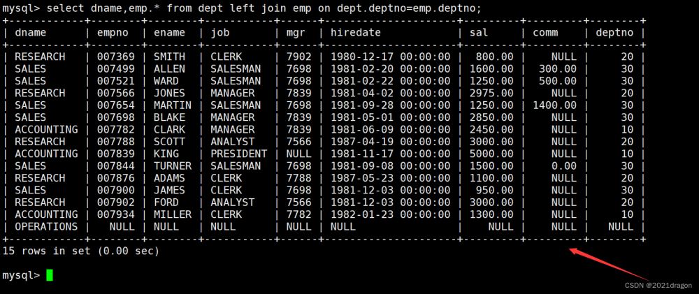 由于題目要求同時列出部門名和員工信息,因此需要將部門表和員工表連接起來,連接條件就是部門的部門號要等于員工所在的部門號。如果直接使用內連接進行查詢,那么將會顯示出所有滿足連接條件的記錄。如下: