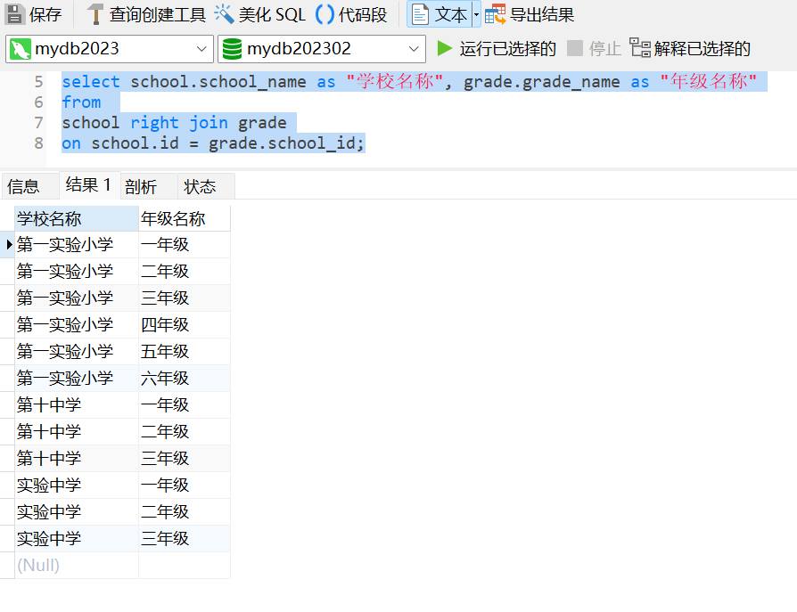 如果年級沒有對應的學校信息,則學校名稱將顯示為NULL。