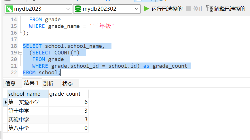 另一個示例是使用子查詢和聚合函數檢索每個學校的年級數。