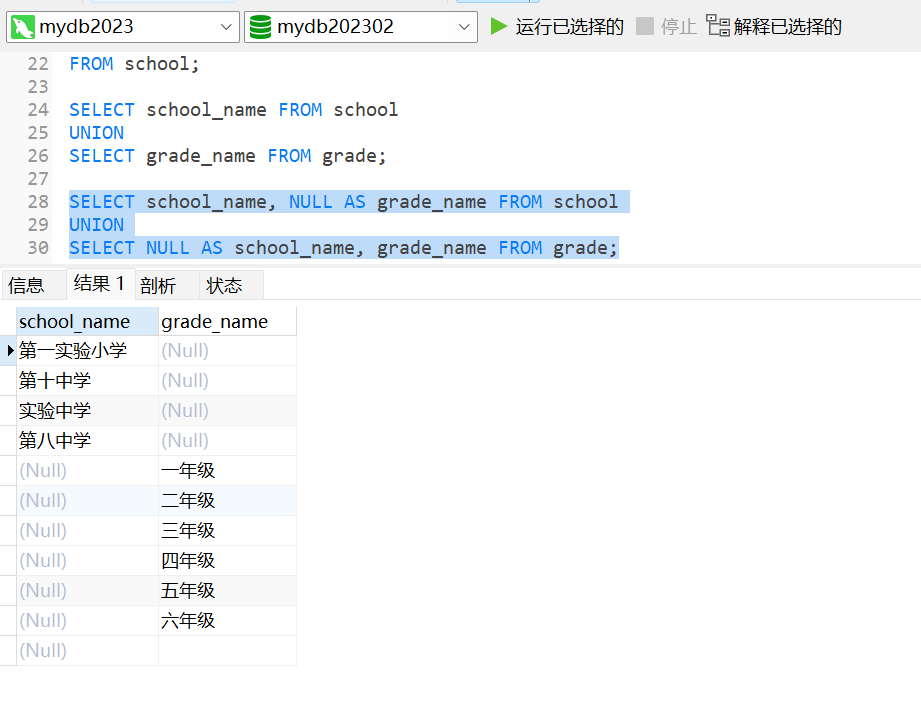 以下是一個使用UNION查詢的示例,用于檢索所有學校的名稱和所有年級的名稱,這些學校和年級存儲在不同的表中: