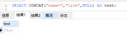 1.SELECT CONCAT(“name=”,“lich”,NULL) AS test;