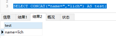 2.SELECT CONCAT(“name=”,“lich”) AS test;