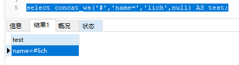 1.select concat_ws(‘#’,‘name=’,‘lich’,null) AS test;