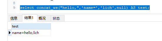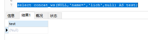 2.select concat_ws(NULL,‘name=’,‘lich’,null) AS test;