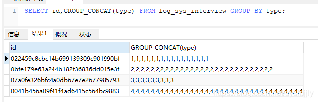 1.SELECT id,GROUP_CONCAT(type) FROM log_sys_interview GROUP BY type ;