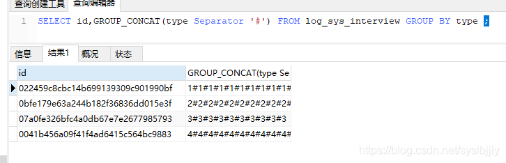 2.SELECT id,GROUP_CONCAT(type Separator ‘#’) FROM log_sys_interview GROUP BY type ;