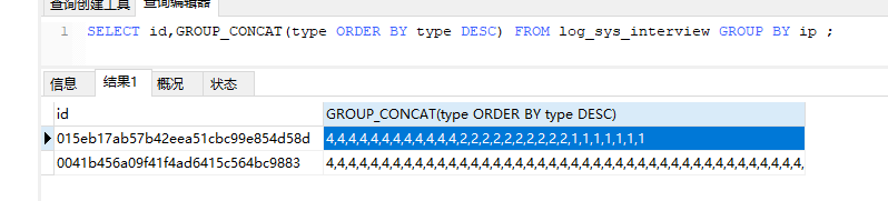 3.SELECT id,GROUP_CONCAT(type ORDER BY type DESC) FROM log_sys_interview GROUP BY ip ;