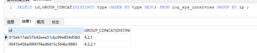 4.SELECT id,GROUP_CONCAT(DISTINCT type ORDER BY type DESC) FROM log_sys_interview GROUP BY ip ;
