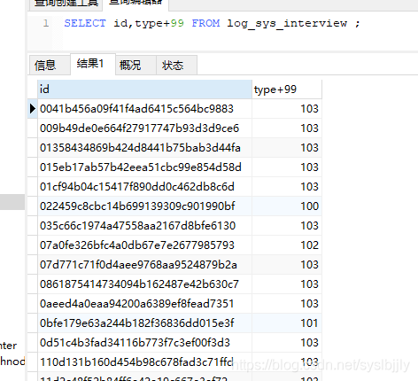 SELECT id,type+99 FROM log_sys_interview ;