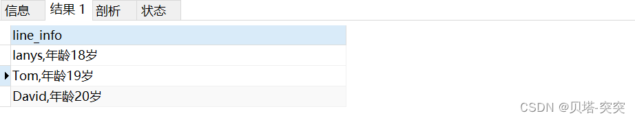 select CONCAT_WS(",",concat(name),concat("年齡",age,"歲")) AS line_info from user