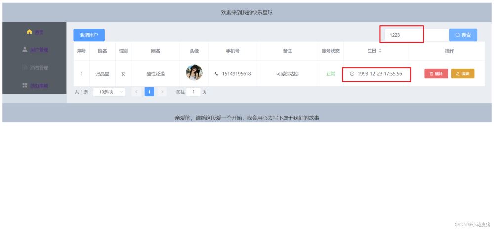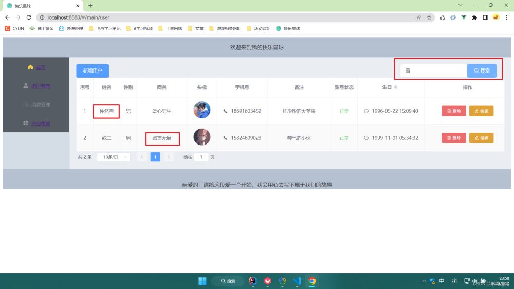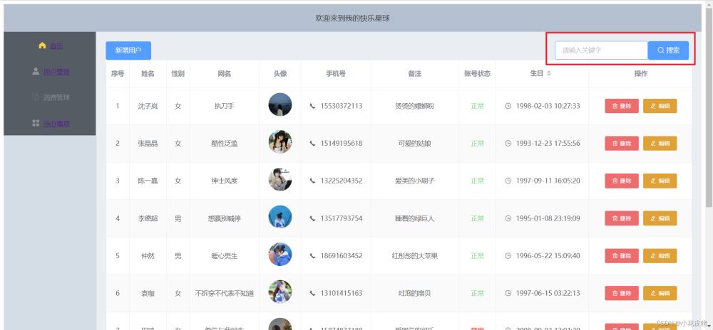 <el-input v-model="keyWord" placeholder="請輸入關鍵字" clearable ></el-input> <el-button type="primary" icon="el-icon-search" @click="queryUserList">搜索</el-button> data() { return {keyWord:"", // 輸入框關鍵字 userTableData: [], // 用戶列表 }, // 展示用戶列表 methods: { queryUserList() { axios.get("http://localhost:9090/user/queryList", { // 傳遞的參數 params: { keyWord:this.keyWord } // 回調函數,一定要使用箭頭函數,不然this的指向不是vue示例 }).then(res =>{ // 請求成功后的數據返回給用戶列表用于展示 this.userTableData = res.data.data; }).catch(error =>{ console.log(error) }) } } mounted() { // 頁面加載就渲染用戶列表 this.queryUserList(); },測試效果