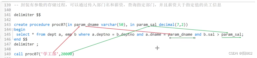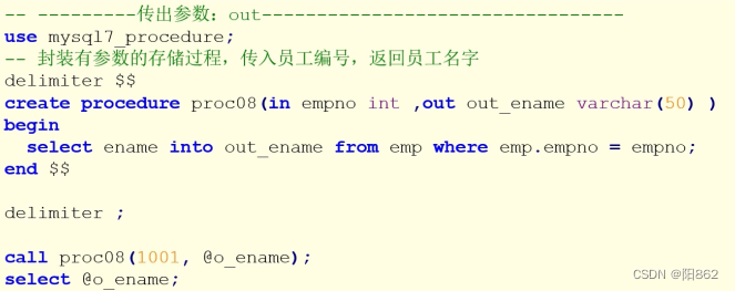 -- 封裝有參數的存儲過程,傳入員工編號,返回員工名字delimiter $$create procedure proc8(in in_empno int,out out_ename varchar(50))begin select ename into out_ename from emp where emp.empno =in_empno;end $$delimiter ; call proc8(1001,@o_ename);-- 執行這一句不會輸出select @o_ename;