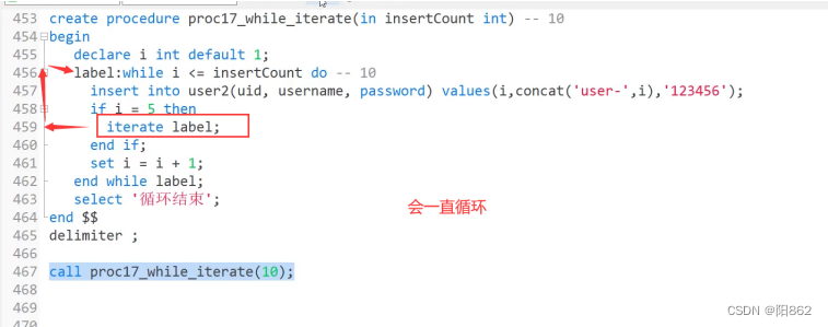 /*【標簽:】while循環條件do 循環體;end while【標簽】;-*/-- 需求:向表中添加指定條數的數據-- -------存儲過程-循環-while delimiter $$create procedure proc18(in in_count int)begin declare i int default 1; label:while i<=in_count do insert into user(id,name,password) values(i,concat("user-",i),123456); set i=i+1; if i=5 then leave label; end if; end while label; end $$delimiter ;call proc18(10);這里我的理解,當要使用leave、iterate時要寫label就相當于一個名字,當然這個label可以用其他字符代替比如a,只要在使用leave、iterate時后面加上自己定義的label就行