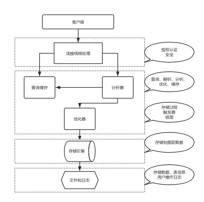 MySQL架構總共四層,在上圖中以虛線作為劃分。