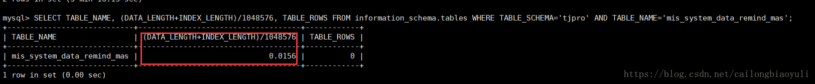 SELECT TABLE_NAME, (DATA_LENGTH+INDEX_LENGTH)/1048576, TABLE_ROWS FROM information_schema.tables WHERE TABLE_SCHEMA="dbname" AND TABLE_NAME="tablename(你的表名)";