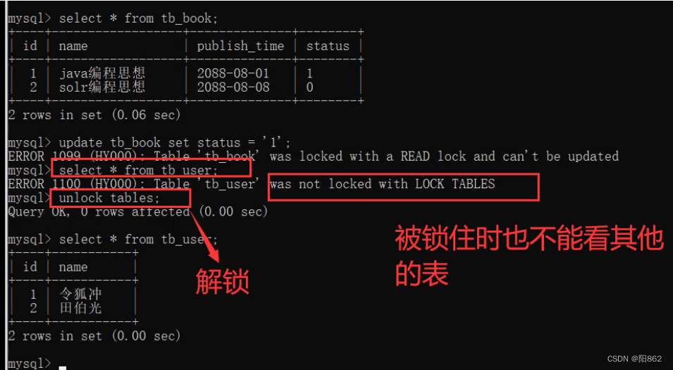 create table tb_book( id int(11) auto_increment, name varchar(50) default null, publish_time date default null, status char(1) default null, primary key (id))engine=myisam default charset=utf8; insert into tb_book values(null,"sql","2088-08-01","1");insert into tb_book values(null,"sql",20880908,"0"); create table tb_user( id int(11) auto_increment, name varchar(50) default null, primary key (id) )engine =myisam default charset=utf8; insert into tb_user values(null,"張三");insert into tb_user values(null,"李四"); -- 加寫鎖lock table tb_book write; select * from tb_book ;-- 能正常輸出select * from tb_book tb ;-- 不能正常輸出,不能有別名update tb_book set status=1;-- 可以修改 寫鎖:可讀可修改,但在沒有解鎖之前不能被其他人查看,會被掛起 select * from tb_user ;-- 不能正常輸出,當鎖住一個表時也不能看其他表-- 解鎖unlock tables;