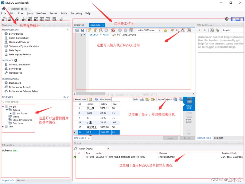 右側為操作區,上部分可以書寫MySQL語句,中部用于顯示查詢及修改數據表,下部用于顯示MySQL語句的執行情況。