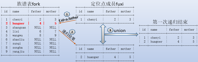 遞歸時,按照f.id=a.father的條件進行篩選,得到id=2的結果,該結果通過union和之前的數據結合起來,作為下一次遞歸的數據源fuxi。