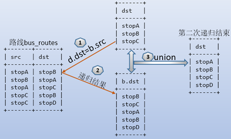 再將定位點成員結果和bus_routes表聯接進行第一次遞歸,如下圖: