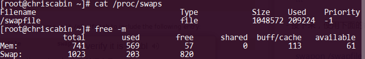 使用 cat /proc/swaps 或 free -m 查看 swapfile 的生效情況,如下圖所示: