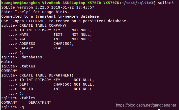 如上圖所示,我們創建了COMPANY DEPARTMENT兩個表。其中ID 作為主鍵,NOT NULL 的約束表示在表中創建紀錄時這些字段不能為 NULL。