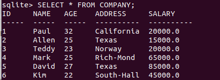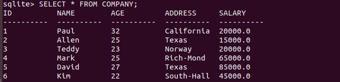 INSERT INTO COMPANY (ID,NAME,AGE,ADDRESS,SALARY)VALUES (1, "Paul", 32, "California", 20000.00 ); INSERT INTO COMPANY (ID,NAME,AGE,ADDRESS,SALARY)VALUES (2, "Allen", 25, "Texas", 15000.00 ); INSERT INTO COMPANY (ID,NAME,AGE,ADDRESS,SALARY)VALUES (3, "Teddy", 23, "Norway", 20000.00 ); INSERT INTO COMPANY (ID,NAME,AGE,ADDRESS,SALARY)VALUES (4, "Mark", 25, "Rich-Mond ", 65000.00 ); INSERT INTO COMPANY (ID,NAME,AGE,ADDRESS,SALARY)VALUES (5, "David", 27, "Texas", 85000.00 ); INSERT INTO COMPANY (ID,NAME,AGE,ADDRESS,SALARY)VALUES (6, "Kim", 22, "South-Hall", 45000.00 );