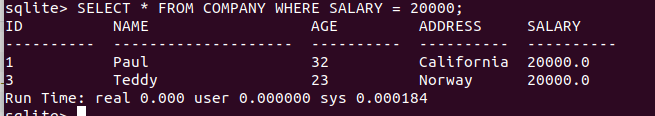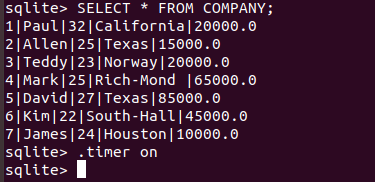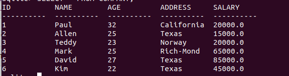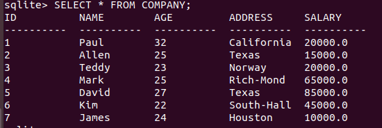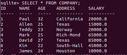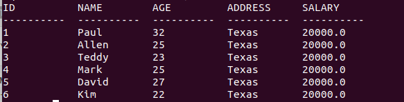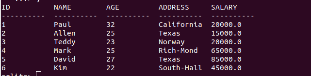 ID NAMEAGE ADDRESS SALARY---------- ---------- ---------- ---------- ----------1 Paul32 California 20000.02 Allen 25 Texas 15000.03 Teddy 23 Norway 20000.04 Mark25 Rich-Mond 65000.05 David 27 Texas 85000.06 Kim 22 South-Hall 45000.07 James 24 Houston 10000.0