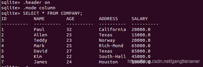 .header on.mode columnSELECT ID, NAME, SALARY FROM COMPANY; --只輸出ID, NAME和SALARY三列