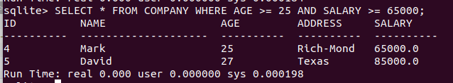 用 SELECT列出AGE 大于等于 25 且SALARY大于等于 65000.00的所有記錄: