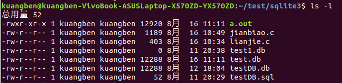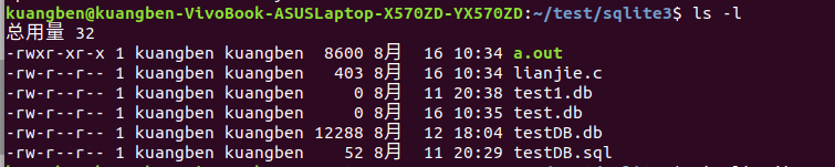 終端輸入ls -l命令發現多了個test.db文件,如圖: