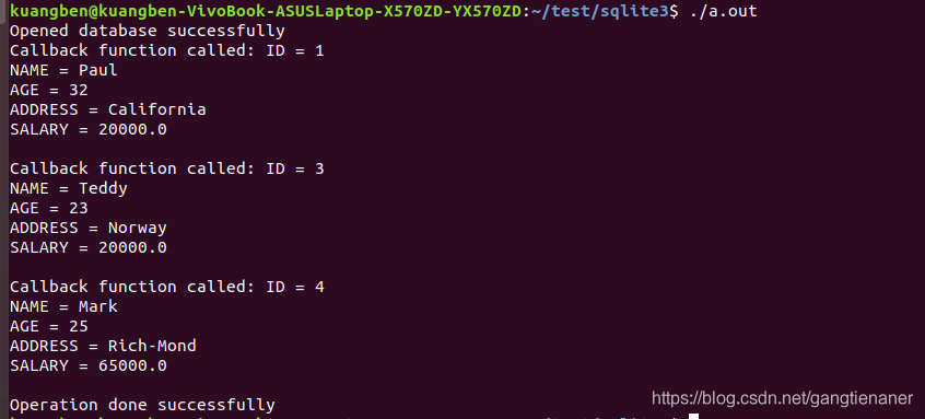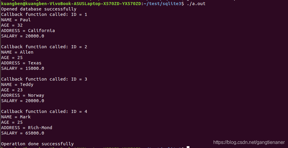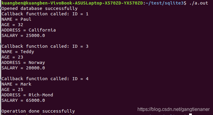 #include <stdio.h>#include <stdlib.h>#include <sqlite3.h> static int callback(void *data, int argc, char **argv, char **azColName){ int i; fprintf(stderr, "%s: ", (const char*)data); for(i=0; i<argc; i++){ printf("%s = %s\n", azColName[i], argv[i] ? argv[i] : "NULL"); } printf("\n"); return 0;} int main(int argc, char* argv[]){ sqlite3 *db; char *zErrMsg = 0; int rc; char *sql; const char* data = "Callback function called"; /* Open database */ rc = sqlite3_open("test.db", &db); if( rc ){ fprintf(stderr, "Can"t open database: %s\n", sqlite3_errmsg(db)); exit(0); }else{ fprintf(stderr, "Opened database successfully\n"); } /* Create SQL statement */ sql = "SELECT * from COMPANY"; /* Execute SQL statement */ rc = sqlite3_exec(db, sql, callback, (void*)data, &zErrMsg); if( rc != SQLITE_OK ){ fprintf(stderr, "SQL error: %s\n", zErrMsg); sqlite3_free(zErrMsg); }else{ fprintf(stdout, "Operation done successfully\n"); } sqlite3_close(db); return 0;}上面程序顯示了如何從前面創建的 COMPANY 表中獲取并顯示記錄,輸出結果如下: