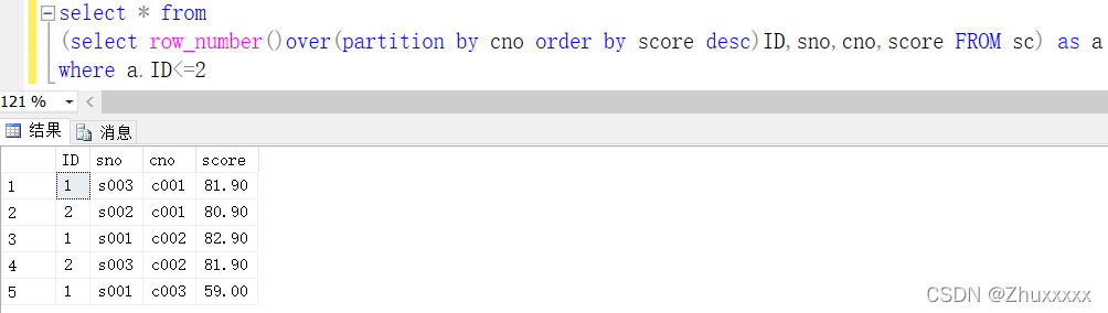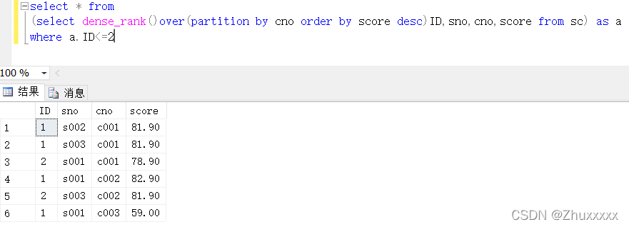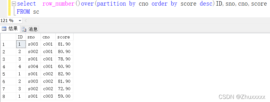 可以看到ID的值以cno為分區(qū)進(jìn)行排序,當(dāng)cno變化時(shí)ID也會(huì)自動(dòng)重新開始計(jì)數(shù),然后再將成績(jī)以降序排列,這樣每科成績(jī)高低及其對(duì)應(yīng)的學(xué)號(hào)就一目了然。