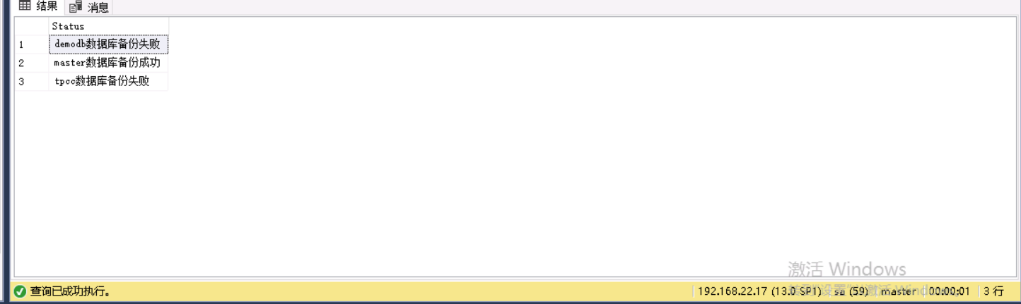 DBCC FREEDECLARE @databaseName1 nvarchar(100)DECLARE @sql nvarchar(4000)DECLARE db_cursor CURSOR FOR SELECT name FROM sys.databasesOPEN db_cursorFETCH NEXT FROM db_cursor INTO @databaseName1WHILE @@FETCH_STATUS = 0 BEGIN SET @sql = " SELECT TOP 1 dt.DatabaseName, dt.StartTime, bs.backup_start_date, bs.backup_finish_date, [Status] = CASE WHEN bs.backup_start_date IS NULL THEN (dt.DatabaseName) + ""數據庫備份失敗"" ELSE (dt.DatabaseName) + ""數據庫備份成功"" ENDFROM sys.fn_trace_gettable( ( SELECTREVERSE( SUBSTRING( REVERSE([path]), CHARINDEX(CHAR(92), REVERSE([path])), 260 )) + N""log.trc"" FROMsys.traces WHEREis_default = 1 ), default ) AS dt LEFT OUTER JOIN msdb.dbo.backupset AS bs ON dt.DatabaseName = bs.database_name AND ABS( DATEDIFF(SECOND, dt.StartTime, bs.backup_start_date) ) < 5WHERE dt.EventClass = 115 AND UPPER(CONVERT(nvarchar(max), dt.TextData)) LIKE N""BACKUP%"" AND dt.DatabaseName=""" + @databaseName1 +""" ORDER BY dt.StartTime DESC" EXEC sp_executesql @sql FETCH NEXT FROM db_cursor INTO @databaseName1END CLOSE db_cursorDEALLOCATE db_cursor